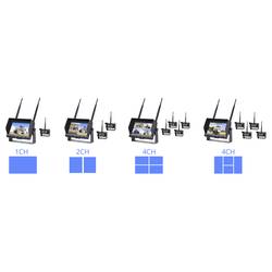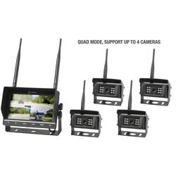 Monitor s úhlopříčkou 7" má čtyři kanály, které lze zaznamenáva současně dohromady nebo jednotlivě. K tomu lze použít SD/TF kartu s kapacitou paměti maximálně 128 GB. Nabízí se normáln zobrazení, zrcadlové zobrazení, zrcadlové otáčení, sdílení, automatické skenování (Auto-Scan) a zobrazení jednotlivých kanálů.. Funkce nočního vidění i automatického ztmavení zajišťují vždy jasný a přehledný obraz. Kamera nabízí zorný úhel 90 stupňů a je odolná vůči prachu a vodě podle normy IP69. Nabídku završuje dálkové ovládání s plným rozsahem funkcí a s vestavěným reproduktorem.