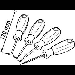 Vložení a odstranění o-kroužků nebo těsnění také k odstranění ochranných krytek u čepů u závěsného otvoru, krátké provedení: 1 x rovný hrot 1 x 90° hrot 1 x háčkový hrot 1 x ocelové hlavy, rozměry / délka: 130 mm
