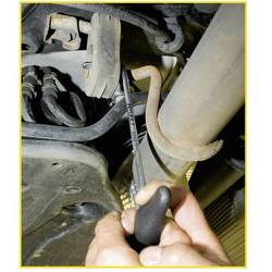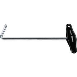Hákový klíč k nasazení/sejmutí gumové násadky výfuku např. pro Ford Fiesta, Orion, Escort, BMW atd. · Hrot 40 mm, ohyb 9 ° · S plastovou T rukojetí · Speciální ocel · Povrch: chromovaný.
