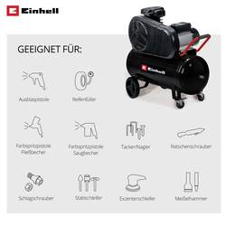 S kompresorem Einhell TE-AC 430/50/10 a vhodnými nástroji můžete okamžitě nanést laky a barvy a impregnovat velkoplošnou nebo cíleně dřeva. Zcela nová třída nářadí je vybavena výkonným kompresorem s klínovým řemenovým pohonem 3.000 W, řemenový pohon zajišťuje nízké otáčky a tichý provoz a nádrž o objemu 50 l nabízí vzduchové rezervy pro trvalé použití. Tisk pro mnoho aplikací až do 10 barů lze nastavit pomocí zmírňujících zařízení, včetně vyfukování nebo pískování. Všestranně nafoukne bez námahy také pneumatiky na auto, motocykl a jízdní kola, míče nebo nafukovací matrace. Dvojitý kompresní jednotka a řemenový pohon zajišťují vysoký dodaný výkon. Dlouhá životnost kompresoru je díky kvalitním komponentům a olejovému mazání čerpadla, kontrola hladiny oleje probíhá přes průzor. Zpětný a bezpečnostní ventil umožňují bezpečné použití. K dispozici jsou manometry a rychlospojky pro regulovaný pracovní a neregulovaný tlak kotle. Kvalita Einhell je dobře přesvědčená a poskytuje 10letou záruku na prorezavění nádrže. Dvě velká kola a dvě otočná kolečka s brzdou zajišťují mobilitu a bezpečné uložení. Vypouštěcí kohout umožňuje pohodlnou údržbu kompresoru.