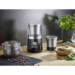 Kompaktní mlýnek od Graef může mletí jak kávových zrn, tak i koření. Díky dvěma nožovým nástavci je každá složka rychle drcená. Součástí dodávky jsou dvě nádobky z nerezové oceli s dvoukřídlovým nožem pro suché potraviny a nádrž s nožem se 4 čepelemi pro vlhké potraviny.
