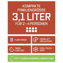 Bezpečnost a pohodlí jsou zde napsány na velkou míru: Rukojeť Cool-Touch umožňuje bezpečné ovládání. Se hmotností pouze 2,7 kg se fritéza navíc snadno přenáší. Horkovzdušná cirkulace vzduchu s proudem vzduchu o 360° zajistí křupavé vnější strany a také chvilé vnitřní strany - a to téměř bez oleje.