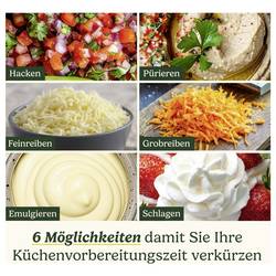 - Sada vše v jednom: Čepel z nerezové oceli, vratná strouhací kotouč a nástavec pro šlehání sněhu - pro maximální flexibilitu při sekání, strouhání, šlehání a šlehání stačí jeden kompaktní přístroj.
