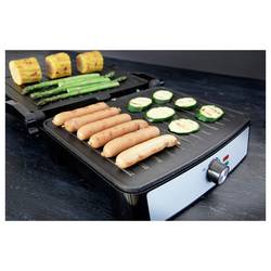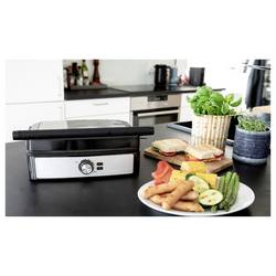 Gastronoma 18240001 je multifunkční kontaktní gril, který je díky své zavěšené horní desce vhodný mimo jiné pro osoby Paninis, toasts, zeleninu, ryby a maso. Díky vysokému výkonu 2200 W a flexibilnímu systému závěsů se grilované pokrmy rychle a rovnoměrně grilují. Kontaktní gril má také nastavitelné tlačítko termostatu, takže máte plnou kontrolu nad teplotou grilování. Gastronoma 18240001 se vyznačuje jedinečnou schopností otevřít až 180 stupňů, čímž se přístroj promění v univerzální stolní gril s grilovací plochou 29 x 23 cm na grilovací desku.