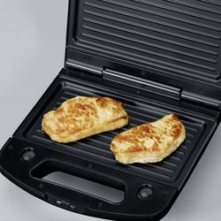 Funkce 3 v 1 díky vyměnitelným plotýnkám: Desky pro toustovač, grilovací desky, bruselské vafle. Nepřilnavá vrstva zabraňuje přilepení pečené pečivo a usnadňuje čištění. Kontrolka provozu a kontrolka připravenosti pro přesnou kontrolu doby pečení.