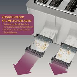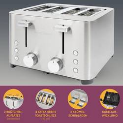 Křupavý toaster, zlatavý, s 2 nastavitelnými stupni opékání a 2 centrovacími funkcemi pro stejnoměrné opečení. Široký slot pro mimořádně široké otvory (40 mm), ideální např. pro Bagelové nebo housenka. Topinkovač má 2 funkce pro rozmrazení, 2 funkce pro ohřívání a 2 funkce pro rychlé zastavení (s podsvíceným bílým podsvícením). 4 plátky Toster s nerezovým pouzdrem Profi Cook se automaticky a manuálně vypíná. Topinkovač se 2 nástavci na rozpékání (odnímatelný) obsahuje 2 zásuvky na drobky (vyjímatelné), navíjení kabelu a gumové nožky zajišťují bezpečné postavení.