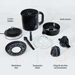 - Odnímatelná konviceOtáčení doleva i dopravaFiltr dužniny2 lisovací kuželyTransparentní krytKapacitaPříslušenství lze mýt v myčce na nádobíProtiskluzové nožky