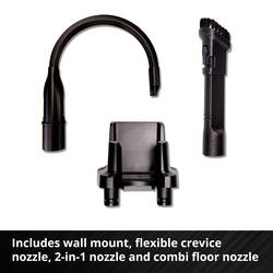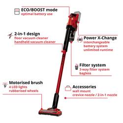 Akumulátorový vysavač na násady TE-SV 18 li-Solo je součástí multifunkčního systému akumulátorů Einhell Power-X-Change bez omezení. K používání akumulátorového vysavače je zapotřebí 18V akumulátor. Nepřerušovaná práce bez kabelu: To umožňuje výměnu akumulátoru Power-X-Change a technologii rychlého nabíjení. Pokud je použitý akumulátor vybitý, lze jej jednoduše vyměnit za plně nabitý. V závislosti na akumulátoru lze navíc dosáhnout velmi dlouhé doby chodu, protože například 6 Ah akumulátor poskytuje vysavač v režimu ECO energii až 80 minut. Čtyři LED bodové světlo a kloub pohyblivý na podlahové trysce ve dvou osách umožňují jednoduché čištění i na tmavých a těžko přístupných místech, jako např. pod postel nebo skříní. Kola s gumou jsou tichá a chrání citlivé podlahové krytiny jako jsou parkety. Díky kompaktnímu a lehkému provedení se aku vysavač i při dlouhodobé práci neunavíte a pohodlně drží v ruce. Tak je vysavač hračkou. Efektivní 3-násobný filtrační systém se skládá z předfiltru, skládacího a omyvatelného skládacího filtru a motorového filtru a integrovaného cyklonové odlučovače zajišťují čistý vzduch a efektivní vysávání s vysokou sací sílou. Nádobku lze snadno vyprázdnit stisknutím tlačítka. Není třeba žádný sáček. To šetří životní prostředí, šetří peníze a zároveň je velmi hygienické, protože uživatel nepřijde do styku s nečistotami. Díky dvěma nastavitelným přísavkám lze vysavač přizpůsobit každé situaci. Režim ECO lze použít pro normální znečištění a maximální dobu provozu, REŽIM BOOST zajišťuje maximální sací výkon při odstranění odolných nečistot, jako např. na kobercích. Díky kombinaci dvou typů je akumulátorový vysavač praktickým 2v1. Lze jej použít jako ruční vysavač, ale i k čištění podlahy, přičemž jako tichý vysavač s perfektním ovládáním působil na dojem. Motorizovaná podlahová hubice byla navržena tak, aby odstranila prach a odolné nečistoty z tvrdé podlahy i z koberců a koberců. Kartáč lze také snadno uvolnit a pohodlně čistit. Součástí dodávky je nástěnný držák, který nabízí místo pro skladování vysavače a příslušenství, takže vše je čistě uloženo, ale je vždy po ruce. Dodaná flexibilní štěrbinová hubice je ideální pro vysávání na těžko přístupných místech, například mezi sedadly v autě. Jedno stisknutí tlačítka stačí k tomu, aby vysavač po celou dobu běží. Tlačítko zapnutí není třeba trvale stisknout.