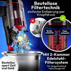 Díky bezsáčkové technice filtrace z nerezové oceli se 2 komorovým systémem zůstává sací výkon konstantní a vyprazdňování trvá pouhé jedno stisknutí tlačítka - bez nutnosti dokupovat drahé sáčky. Funkce 2 v 1 umožňuje použití jako podlahový a ruční vysavač, ideální pro ideal nábytek, polstrování, záclony nebo autosedačky.