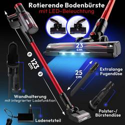 Příslušenství: Nabíječka, velmi dlouhá štěrbinová hubice, nástavec na polstrování/kartáč, nástěnný držák