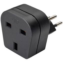 Cestovní adaptér se zásuvkou s ochranným kontaktem ze zásuvky typu J na zásuvku typu G s vestavěnou závěrkou a pojistkou.