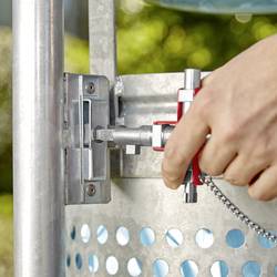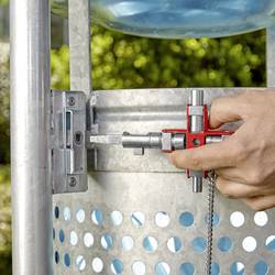 Pro uzamykací systémy v elektrotechnice, zásobování vodou a plynem, klimatizaci a ventilační technice, průmyslu, technickém vybavení budov atd. Pro 9 různých typů uzávěrů ze zinkového tlakového odlitku v jednom klíči S odnímatelným řetězem a karabinou. Provedení "stavba" se zásuvným, magnetickým nástavcem: unašeč pro zámky s PZ děrováním a stupňovitým čtyřhranem S upínačem bitů pro 1/4" bity s magnetem. Délka ramena: 157/95 mm. Zinkový tlakový odlitek