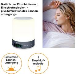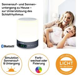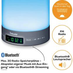- Přirozené usínání a jemné probouzení s barevnou simulací východu a západu slunce a melodiíBarevná simulace východu a západu slunceMožnost volby mezi rádiem, zvukem budíku, 2 budícími melodiemi a 1 uspávacími melodiemiNáladové LED osvětlení s proměnlivou barvou a individuálním nastavením barvy2 nastavitelné časy buzení30 paměťových míst pro rádiové staniceNastavitelná intenzita světla (3 stupňů)Nastavitelný jas displejeFunkce opakovaného buzení (Snooze) 1-30 minut.Lze použít jako lampičku na noční stolekVstup Aux-in pro přehrávání vlastní hudby (vč. Aux kabelu).Přehrávání hudby přes Bluetooth®