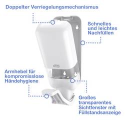 Zásobník Tork s páčkou pro mýdla a závěsné dezinfekční prostředky je určen pro použití v oblastech, kde je velmi důležité mít hygienu. Lze jej použít v mnoha mýdlech, dezinfekčních prostředcích a lomenech z Tork hygienických podmínek, aby vyhověl speciálním požadavkům vaší operace. Efektivní dávkování, variabilní množství mýdla a certifikace „Easy to use“ podporují dobrou hygienu pro všechny uživatele*uvnitř. Na své hosty vás zapůsobí svým funkčním a elegantním designem, který je všestranným dárcem pro dezinfekci mýdlem a rukou.