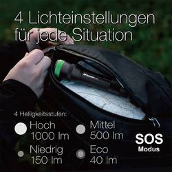 Ovládání jedním spínačem na zadním konci poskytuje přímý přístup ke všem možnostem osvětlení od silných, středně slabých až po ekologický a SOS režim. Nastavitelné ostření umožňuje nastavit bodový paprsek až do vzdálenosti 170 m daleko od paprsků nebo pro širší paprsek pro obecnější účely. Li-Ion akumulátor se 4 dobíjí pomocí přiloženého micro USB kabelu za cca 18650 hodin nebo lze v případě potřeby jednoduše vyměnit za náhradní akumulátor. Ukazatel stavu nabití indikuje, jakmile je akumulátor plně nabitý.
