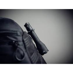 Ocelový úchyt s černým povrchem odolným proti korozi pro upevnění na oblečení, vybavení nebo pásek. Nastavitelné poutko na ruku z velmi pevného paracordu s ocelovým karebem pro rychlé připevnění na svítilnu.