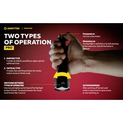 Dva způsoby ovládání: Lov a taktický. Taktický typ umožňuje rychlý přístup k maximální svítivosti a režimu stroboskopu