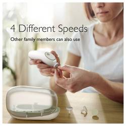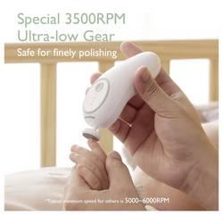 Nejnižší nastavení s 3500 ot./min umožňuje jemnou a přesnou péči o nehty. Funkce Touch-and-Stop brání zraněním, i když se vaše dítě pohybuje.
