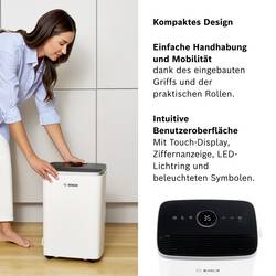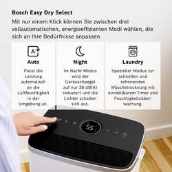 Odvlhčovač vzduchu řady Dry značky Bosch odstraňuje přebytečnou vlhkost ze vzduchu a zajišťuje tak zdravější a pohodlnější klima v místnosti. Speciální režim sušení prádla zajišťuje šetrné a efektivní sušení prádla.