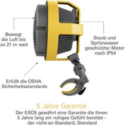 Zirkulator Vornado EX05 je speciálně navržen pro zvláštní požadavky domácích kutilů. Stojan a montážní držák lze umístit, zavěsit nebo upevnit téměř kdekoliv a je ideal pro náročné podmínky. Pouzdro EXO nabízí velkou odolnost proti nárazům na tvrdých místech a výkonný motor s kuličkovými ložisky je dobře chráněn proti prachu a nečistotám. EX05 je silný, univerzální a odolný.