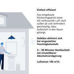 Příjemný čas v koupelně, díky vylepšenému klimatu v místnosti a zaručuje tichý provoz s hladinou hluku pod 38 dB(a); jednoduché a pohodlné ovládání, díky automatické aktivaci při překročení nastaveného stupně vlhkosti a 3 - 30 minut zpoždění vypnutí. Vzduch z místnosti je odváděn ven, zabraňuje pronikání vnějšího vzduchu do místnosti, jednoduchá montáž jednou osobou pomocí standardního nářadí. Možná montáž na stěnu a strop; exkluzivní design, který se hodí do každé koupelny.