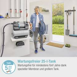 Domácí vodárna 6300 SilentComfort od společnosti GARDENA je velmi výkonná a úsporná. Umožňuje použití vhodné dešťové nebo studní vody pro zalévání zahrady nebo jako užitkové vody v domácnosti, například na toaletách. Voda ze studní, cisteren nebo sudů se čerpá na místě výtlačná výška 49 metrů (4,9 bar). Voda může nasávat z hloubky až 8 metrů. Průtok je 6300 litrů za hodinu při nízké spotřebě energie 1050 wattů. Domácí vodárna automaticky zapíná a vypíná podle potřeby vody. Díky velké paměti pro stanice 25 l jej lze snadno ovládat a přitom pracuje velmi tiše a levně. Domácí vodárna SilentComfort byla vyvinuta v Německu a pracuje s akustickým tlakem pouze 75 dB(a) na vzdálenost 5 m mimořádně tiše. Umožňuje to inovativní, vodou chlazený vícestupňový systém. Tato technologie nevyžaduje ventilátor, protože odpadní teplo je odváděno vodou. To zajišťuje nejvyšší účinnost a nejmenší hluk. Všechny funkce tlakového čerpadla, jako je spouštění nebo zastavení, lze díky Bluetooth ovládat ze vzdálenosti až 10 m od displeje smartphonu nebo tabletu. Například je vytvořen časový plán zavlažování pro dovolenou nebo samostatně dostupný senzor půdní vlhkosti (obj. Č. 1867-20) pro optimální zásobování vodou a zavlažování s úsporou vody. Je možné používat časovač, sledovat tlak nebo přizpůsobovat tlaky při zapínání a vypínání individuálním potřebám. Až na vytvoření zavlažovacího plánu lze tyto funkce ovládat i pomocí tlačítek na LCD obrazovce v domácí vodě. V nádrži na vodu o objemu 25 litrů je zabudovaná vysoce výkonná membrána. To nevyžaduje, aby byl po dobu nejméně pěti let znovu naplněn vzduch, ani aby byla membrána vyměněna. Pouzdro je chráněno před korozí, protože vnitřní povrch nádrže je tvořen vodotěsným, vícevrstvým oděvem. Integrované spojení čerpadla a nádrže je vyrobeno z nerezové oceli. Z tohoto důvodu má mimořádně dlouhou životnost a je dobře chráněn a umožňuje kompaktní rozměry pro vestavbu při maximální účinnosti. Keramický systém s dvojitým těsněním, ochrana proti běhu na prázdno a proti přehřátí (voda a motor), volitelná detekce kapek vody a integrovaný filtr. Díky němu nemohou do energeticky úsporného čerpadla nebo do vybrání proniknout žádné částečky nečistot. Čerpadlo upozorní na přání při čištění filtru a pomůže vám v aplikaci App s návodem v 28 jazycích. Za tím účelem se v App a digitálním displeji na krytu zobrazí tlak. Díky integrovanému zpětnému ventilu je domácí vodárna SilentComfort 6300 okamžitě připravená k použití. Tato chytrá a volitelně volitelná funkce Power Power Boost se používá při zavlažování zahrady. Funkce automaticky rozpozná zvýšenou spotřebu vody a deaktivuje předpokládaný vypínací tlak nádrže. Tím je nabízen maximální tlak čerpadla. Problém kolísání tlaku v zavlažování, který je typický pro domácí vodárny, je tím minulostí a vzniká tak výkon, který je jinak známý např. pro zahradní čerpadla. Pokud je zavlažování prováděno, čerpadlo se automaticky přepne do úsporného tankovací režimu. Domácí vodárna s dlouhou životností se vyznačuje kvalitními materiály, jako je nerezová ocel, pro hnací hřídel, přípojky a motor a kryt vody. Jeden ze dvou výstupů je otočný o 180°. Díky velkému plnícímu otvoru a spouštěcímu ventilu je velmi snadné naplnit domácí vodárnu a snadno ji chránit před mrazem.