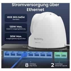 Reolink RLA-PS1 10-portový PoE switch je výkonný a spolehlivé řešení pro napájení a připojení PoE zařízení. Tento switch je vybaven 8 porty PoE+ (10/100Mb/s) a 2 porty Gigabit Ethernet Uplink (10/100/1000Mbit/s) a nabízí univerzální a výkonný způsob napájení vašich PoE zařízení, jako např. monitorovací kamery. Switch splňuje IEEE802.3af/at výkon až 30 W na PoE port. S celkovým výkonem 120 W je vhodný pro moderní bezpečnostní a síťová řešení. Switch splní požadavky i při profesionálním použití v soukromé sféře a zajišťuje stabilní síťové prostředí.