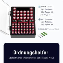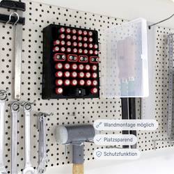 Úložný box pro 56 baterií nebo kompatibilních akumulátorů pro velikosti 32x baterie AAA, 20x baterie AA a 4x baterie 9V včetně 32 x baterie AAA a 20 x baterie AA.