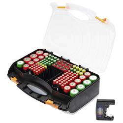 Box na baterie s testovacím přístrojem na baterie. Pro uložení následujících velikostí baterií: