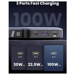 Výkonná stanice 3v1: Celkem 3 portů (USB-C1: 100 W Max; USB-C2: 30 W Max; USB-a: 22,5 W Max) zaručuje těmto powerbance UGREEN efektivní nabíjení ve vysoké rychlosti pro svá zařízení. Díky 3 portům a funkci rychlonabíjení může nabíjet až tři zařízení současně a podporuje také obousměrné nabíjení, které poskytuje příkon 65 W a nabíjí se sama, zatímco USB-C1 port je připojen k 65W nabíječce.