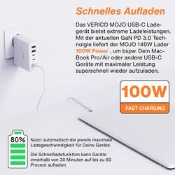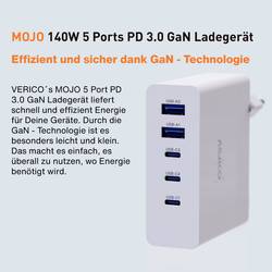 - Verico Mojo 140W je opravdový silák vybavený nejmodernější technologií GAN. Současně lze nabíjet až 5 zařízení. Díky technologii GAN je velmi lehký a kompaktní.