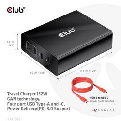 Cestovní nabíječka club3D CAC-1906 s 132 W GAN technologií, USB typu a a C se 4 porty, podpora Power Delivery (PD) 3.0 je výkonná a lehká cestovní nabíječka s maximálním výstupním výkonem 132 W. vybavena 3 porty USB typu C a 1 konektorem typu a poskytuje celkový výkon až 132 W, was a ply požadavky pro současné nabíjení 4 zařízení. Kompatibilní s více zařízeními (podporuje mobilní telefony, tablety a notebooky). Je to praktický pomocník na cestách i v práci! Kompaktní velikost a vysoký výkon: Díky technologii GAN je tato nabíječka o 50 % menší než 65 W nabíječka pro MacBook, dostatečně malá, aby ji bylo možné vzít všude s sebou. Nabíječka Power Charger je lehká, bez kompromisů v kvalitě a bezpečnosti.