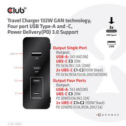 club3D CAC-1906 napájecí adaptér k notebooku, GaN, USB Power Delivery (USB-PD) , 3x USB-C®, 1x USB A , 132 W, Dodávka energie, černá