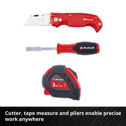 Měřicí a řezací nástroje - nůž na řeznou nůž s náhradními čepelemi, měřicí pásmo a kombinované kleště umožňují přesné řezy a přesné měření