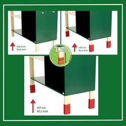 Výškově nastavitelný dětský pracovní stůl je vyroben z dřeva v oblíbeném designu značky Bosch. Pracovní deska nabízí mnoho funkcí učení a také praktická odkládací plocha pro aku šroubovák Bosch Bosch na baterie a mechanickou kotoučová pila se zvukem. Pod pracovní deskou můžete skrýt četné příslušenství - na regálovém dna, v zásuvce a v odolném boxu pro nářadí najdete šroubováky a klíče, kladívko, kleště, pilku, úhel, měřidla, svěráky, šrouby, matice a šroubovací prvky se vejdou do různých velikostí a tvarů. Mnoho dětských nástrojů lze také pomocí praktických háků zavěsit na zadní stěnu. Obzvláště dobře se používají u malých řemeslníků*přilby a bezpečnostní rukavice, jakož i u montážních vozidel 5v1 a popisovatelných dveří, na kterých lze ukládat stavební plány nebo úkoly (kříž není součástí dodávky).