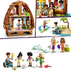 Rodinná dovolená LEGO Friends na pláži (42673), sada obsahuje 6 LEGO Friends minifigurek, jednu figurku Delfin a želva jako postavy zvířat a příslušenství pro možnost kreativního hraní pro děti. Nabízí velké množství zábavy v rekreačních zařízeních pro dívky a chlapce od 8 let.