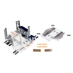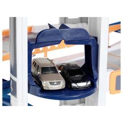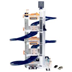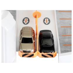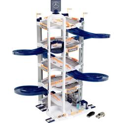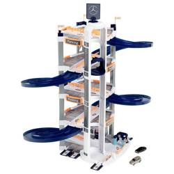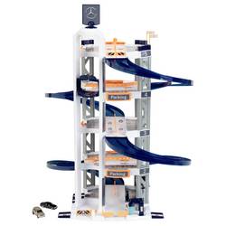 Parkovací dům s Mercedes-Benz designem, 85 cm, má dvojitý jízdní kolo, na kterém se mohou dvě malá auta dodat závod nebo velké auto elegantně odjíždět. Do parkoviště patří židle pro řidiče, čerpací sloupek, pračka a dvě auta.
