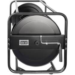 Kabelový buben z černého práškově lakovaného ocelového plechu, vhodný pro velké délky kabelů a průřezy.