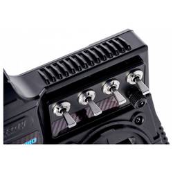 Reflex Stick Multi pro LCD - profesionální, moderní a technicky kvalitní 14-kanálové dálkové ovládání s 15 paměťovými místy pro univerzální použití v mnoha RC vozidlech a lodích. Lze ovládat nezávisle 14 kanály pomocí 2 ovládacích pák a 10 spínačů (4x tlačítko / 4x spínač / 2x otočný potenciometr), například funkce jako je světlo/zvuk, klakson, lanový naviják, opěra, vodní čerpadlo a hasicí monitor. REFLEX STICK Multi pro 14 Channel LCD System je plně kompatibilní s MFC 01/03 a DMD jednotkou Tamiya.