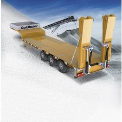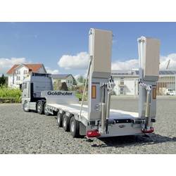 Návěs Goldhofer BAU STN-L3 odpovídá skutečné předloze do posledního detailu. Návěs je vybaven mnoha speciálními funkcemi: například podporuje sadu osvětlení pro typická 7komorová světla. Rozdělenou nájezdovou rampu lze složit. Návěs je osazen 3 nápravami s dvojitými pneumatikami. Podvozek je osazen maketou vzduchového pérování. Rám je vyrobený z 1 mm silného plechu vyřezávaného laserem a ohýbaného a svařovaného metodou CNC. Takže můžete na návěsu bez obav převážet i těžší modely. Všechny podpěry jsou mechanicky nastavitelné. Díky rozděleným nájezdovým rampám sklopným v různých úhlech můžete nakládat a převážet nejrůznější modely. Plošina navíc nabízí dodatečnou ložnou plochu. Stejně jako skutečný návěs má i tento model obložení ze skutečného dřeva. Velikou výhodou návěs Goldhofer je jeho všestrannost: tento téměř jeden metr dlouhý model je vhodný ke všem tahačům značky TAMIYA.