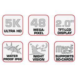Kromě toho má Black800 5K integrovaný mikrofon, reproduktor, ochranu heslem, režim časosběru, údaj o datu, čase, fázi měsíce a teplotě. Díky funkci trvalého nahrávání může kamera i při plné paměťové kartě dále nahrávat, když přejde nejstarší soubory. Funkci trvalého nahrávání lze deaktivovat. Díky montážním páskům nebo praktickému držáku, který je součástí dodávky, lze kameru na pozorování divoké zvěře (IP66) bez námahy upevnit na požadované místo.