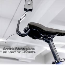 FISCHER cykloplift ProfiPlus, nosnost 57 kg, stropní držák FISCHER ProfiPlus, je prostorově úsporná a praktická varianta pro uložení těžkých a objemných předmětů, jako jsou elektrokola, střešní boxy a jiná zařízení. Na strop lze zavěsit až 4 metry na jízdní kolo a jiné předměty, čímž se ušetří místo na podlaze. S FISCHER NA stropě FISCHER Cyclift ProfiPlus má nosnost až 57 kg a je tak vhodný i pro těžká jízdní kola, elektrokola a Pedelecs. Lankový systém včetně dvou pásů pro zvedání podporuje zvedání a najíždění jízdního kola. Ty umožňují individuální nastavení výšky. S pogumovanými upevňovacími háky můžete zabránit poškrábání laku na jízdním kole nebo elektrokokola. Držák na kolo je dodáván včetně všech upevňovacích materiálů, háků na zeď a návodu k obsluze, takže montáž na strop v garáži nebo ve sklepě je velmi jednoduchá.