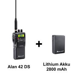 K provozu radiostanice s alkalickými bateriemi jsou přiloženy dvě přihrádky na baterie. Ta lze také vyměnit za adaptér palubního napětí se 12V autozásuvkou, abyste mohli přístroj provozovat v autě. Externí antény CB s konektorem PL se připojují přes přídavný anténní konektor adaptéru palubního napětí. Digitální Squelch činí ovládání Alan 42 DS obzvlášť pohodlné a zaručuje v každém okamžiku optimální citlivost přijímače.