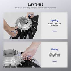 Měkké pouzdro Neewer SF85Q s průměrem 85 cm je určeno speciálně pro profesionální fotografování a video produkci. Poskytuje rovnoměrné a rozptýlené osvětlení, které je ideální pro ideal portréty a produktové záznamy. Kromě toho lze světlo ideálně kontrolovat ideal díky mřížce na pláže. Měkký box je vybaven Bowels Mount, což was umožňuje snadnou montáž na různé světelné zdroje. Díky skládacímu designu a přiložené přepravní tašce lze SF85Q snadno přenášet a uložit, zatímco odolná konstrukce zaručuje vysokou stabilitu. Tento Softbox je nepostradatelným nástrojem pro fotografování a fotografování či natáání, které potřebují kvalitní řízení světla.