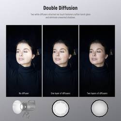 - 85 cm měkký parabol; kvalitní parabol, téměř kulatý; materiál: Vodotěsná Oxford-bavlna; 16 odolných a flexibilních hliníkových žeber; pohodlné napnutí díky rychlouzávěru; připojení pro obloukové výboly; tvar: Šestnáctý (hexadecagonální); barva: stříbrná (vnitřní), černá (vnější); průměr: 85 cm; hmotnost: 1,5 kg; rozměry v zabaleném stavu: 74 x 20 x 20 cm; včetně mřížkové mřížky (83 cm); včetně vnitřního difuzéru (64 cm) a vnějšího difuzéru (81 cm); vč. přepravní tašky