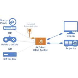 2portový HDMI splitter 4K Manhattan s integrovaným zesilovačem signálu rozděluje 4K HDMI signál z jedné UHD zdroje na dva UHD displeje.