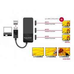 Tento rozdělovač od Delock přijímá signál DisplayPort z počítače nebo notebooku a dělí jej na tři připojené obrazovky. Díky tomu lze k jednomu DisplayPort konektoru připojit tři DisplayPort monitory.