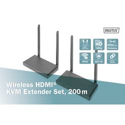 Bezdrátová sada HDMI® KVM Extender přenáší bezdrátově video a audio signály s rozlišením Full HD na vzdálenost až 200 m (neomezený výhled). Díky funkci KVM lze k přijímací jednotce připojit myš či klávesnici, která umožňuje ovládání zdroje signálu přímo na výstupním zařízení. Pomocí HDMI Loop-Out na vysílací jednotce je možné připojit místní monitor pro kontrolu výstupu na přijímači. Funkce Auto Pairing slibuje snadnou instalaci.