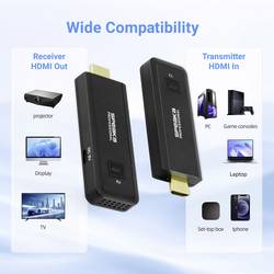 - Umožňuje bezdrátový přenos audio a video signálů z zdrojového zařízení HDMI (např. Blu-ray přehrávače, notebooku) na HDMI zobrazovací zařízení (např. televizor, projektor).
