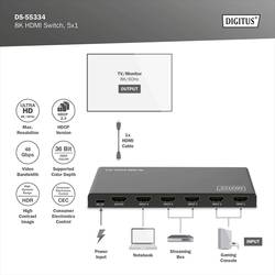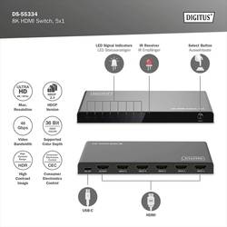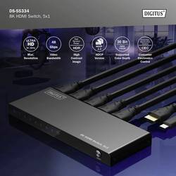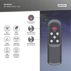 Digitus DS-55334 1 + 5 portů HDMI přepínač LED ukazatel, s dálkovým ovládáním, UHD, kovový ukazatel, lze spínat jednotlivě, se stavovými LED 7680 x 4320 Pixel